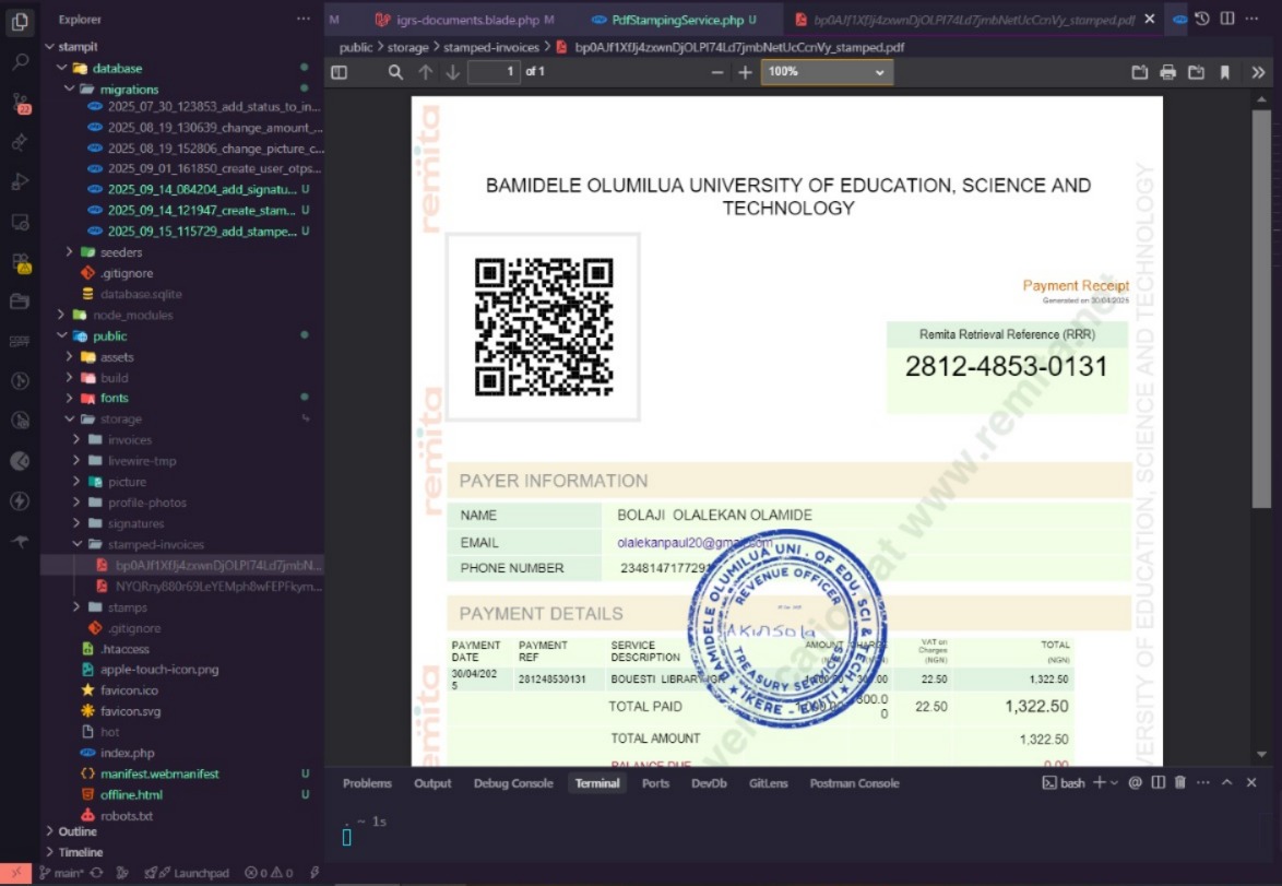 Stampit is a Digital Fee Verification System designed to modernize how schools authenticate fee receipts and IGR payments. Built as a two-sided solution, it replaces slow, manual stamping processes with fast, secure, and fully digital verification.
